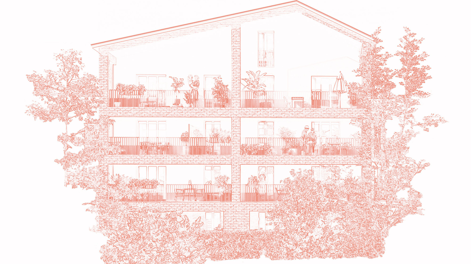 Ainsi, elle alterne les volumes, rythmés par les toitures à deux pentes et d’élégants parements de briques, que l’on retrouve sur les maisons alentours. La brique brune, parfois utilisée en moucharabiehs pour remplacer les garde-corps, se marie avec un enduit minéral beige. Ce camaïeu de couleurs chaudes est mis en valeur par la verdure des terrasses. Enfin, le bois clair des balcons et des pare-vues, légèrement ajouré pour mieux accueillir la lumière, apporte un supplément de douceur à cette réalisation conçue pour être plus respectueuse de l’environnement.